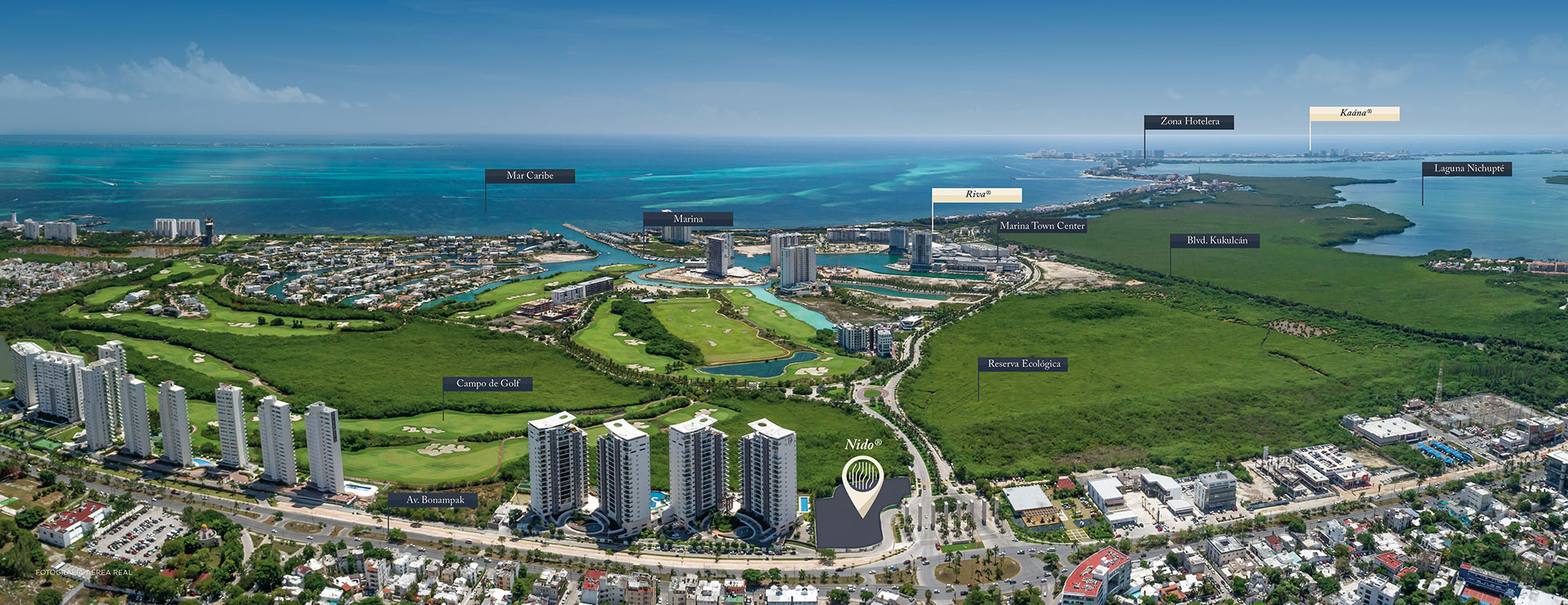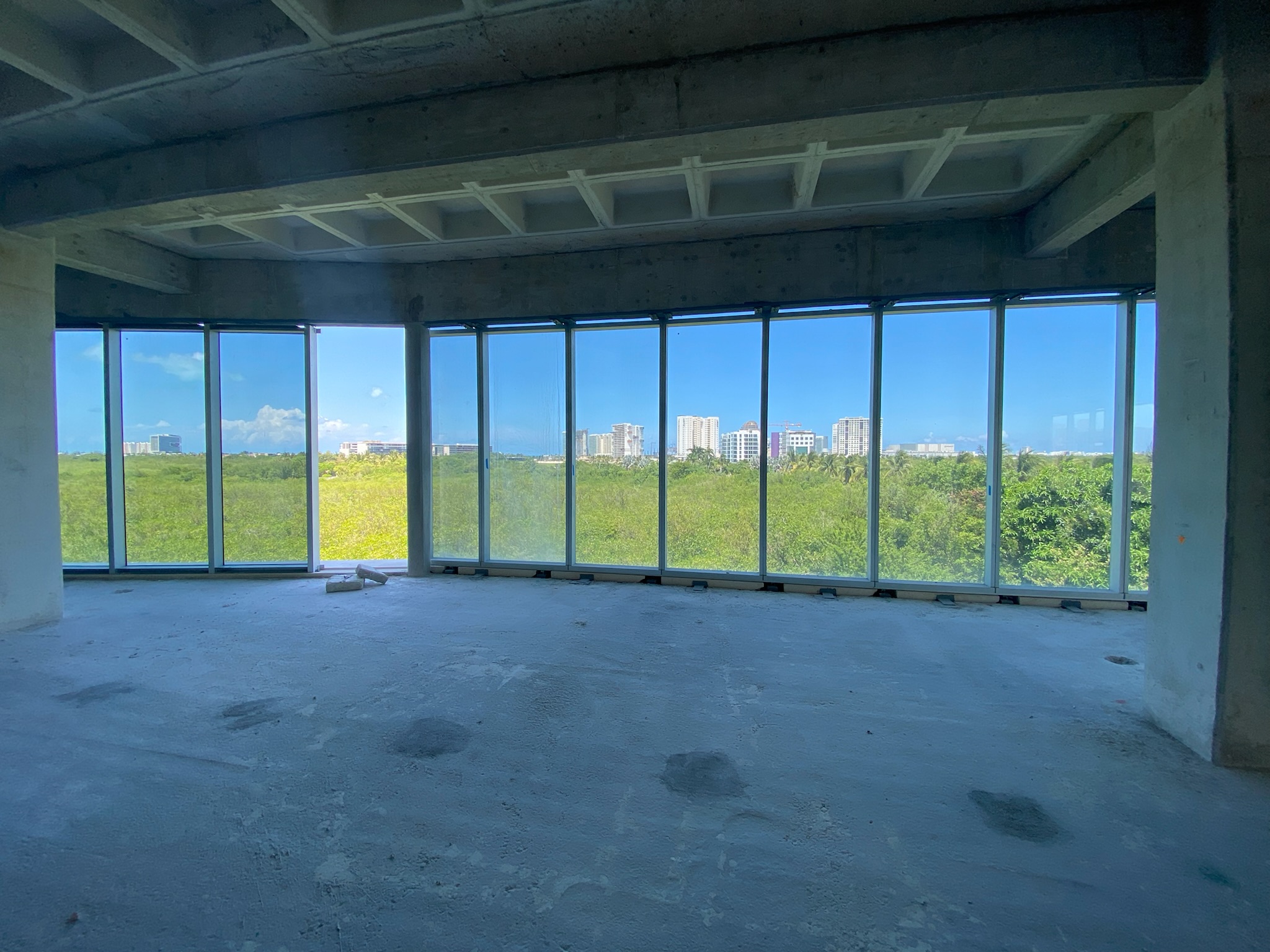 Espectaculares vistas hacia Puerto Cancún, el campo de golf, la reserva ecológica y Av. Bonampak.