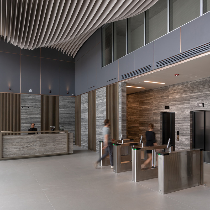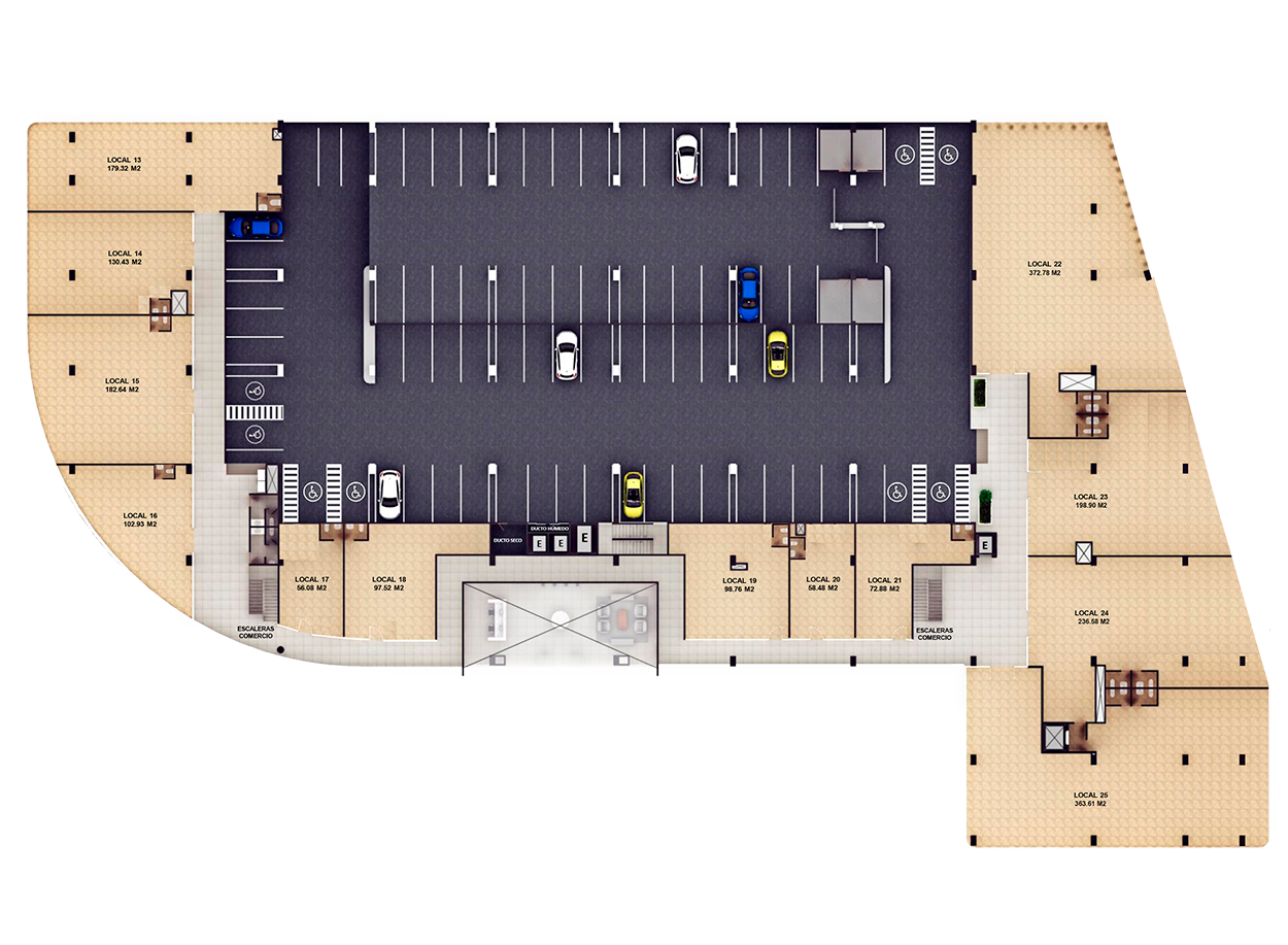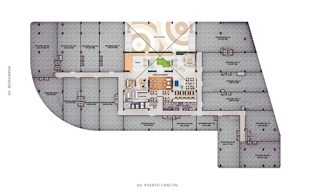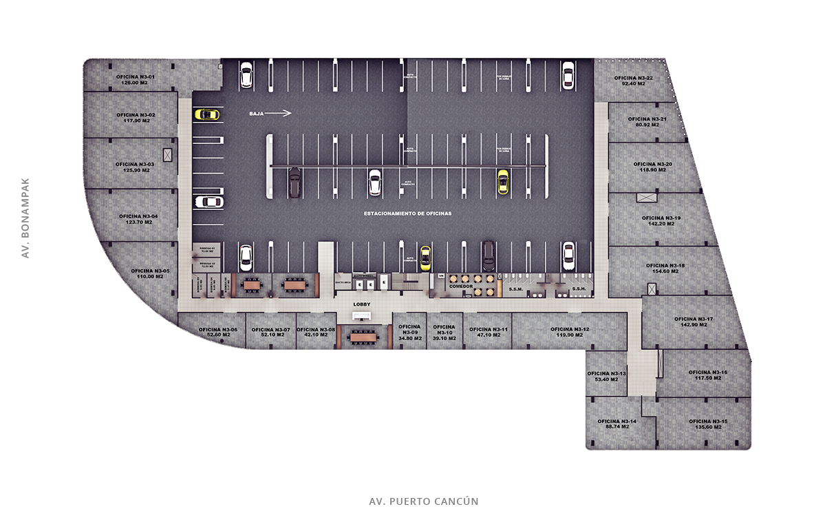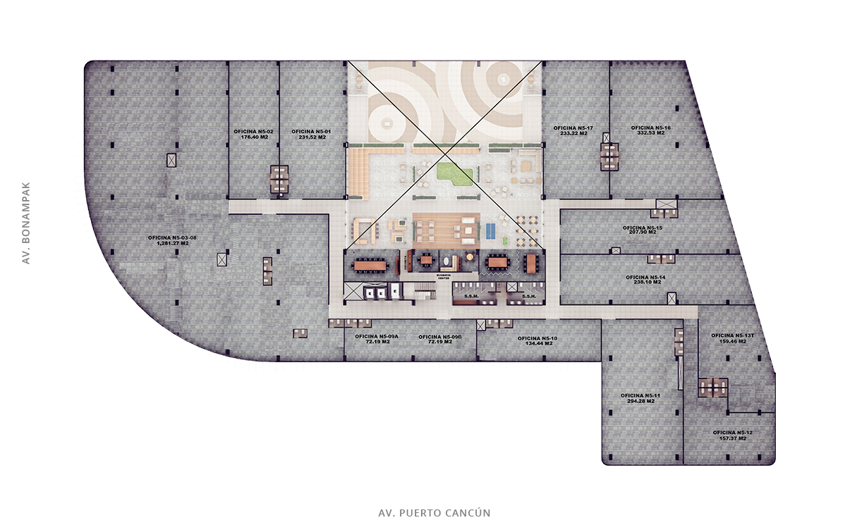Lobby con recepción, salas de juntas, atrio lounge, comedores para empleados, 3 elevadores de alta velocidad y 1 elevador de servicio, sanitarios, bodegas, terrazas y estacionamiento techado.